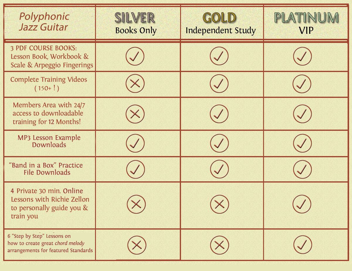 Before I describe each level, let me share a quick disclaimer. Jazz harmony and arranging are complex skills, and in my experience, most guitarists can’t fully master them without regular interaction with a qualified mentor. One-on-one guidance makes a huge difference. That said, unless you’re already fairly advanced or on a very tight budget, I recommend the Platinum Level so I can personally mentor you and help take your playing to the next level. Please keep this in mind when deciding which option is best for you.